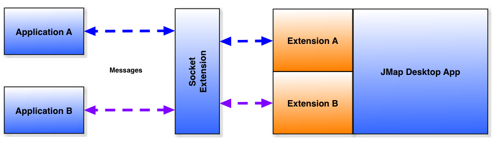To communicate, external applications and JMap extensions send messages that are in fact byte arrays. The contents of these byte arrays is interpreted on either side. The Socket extension does not interpret their content.