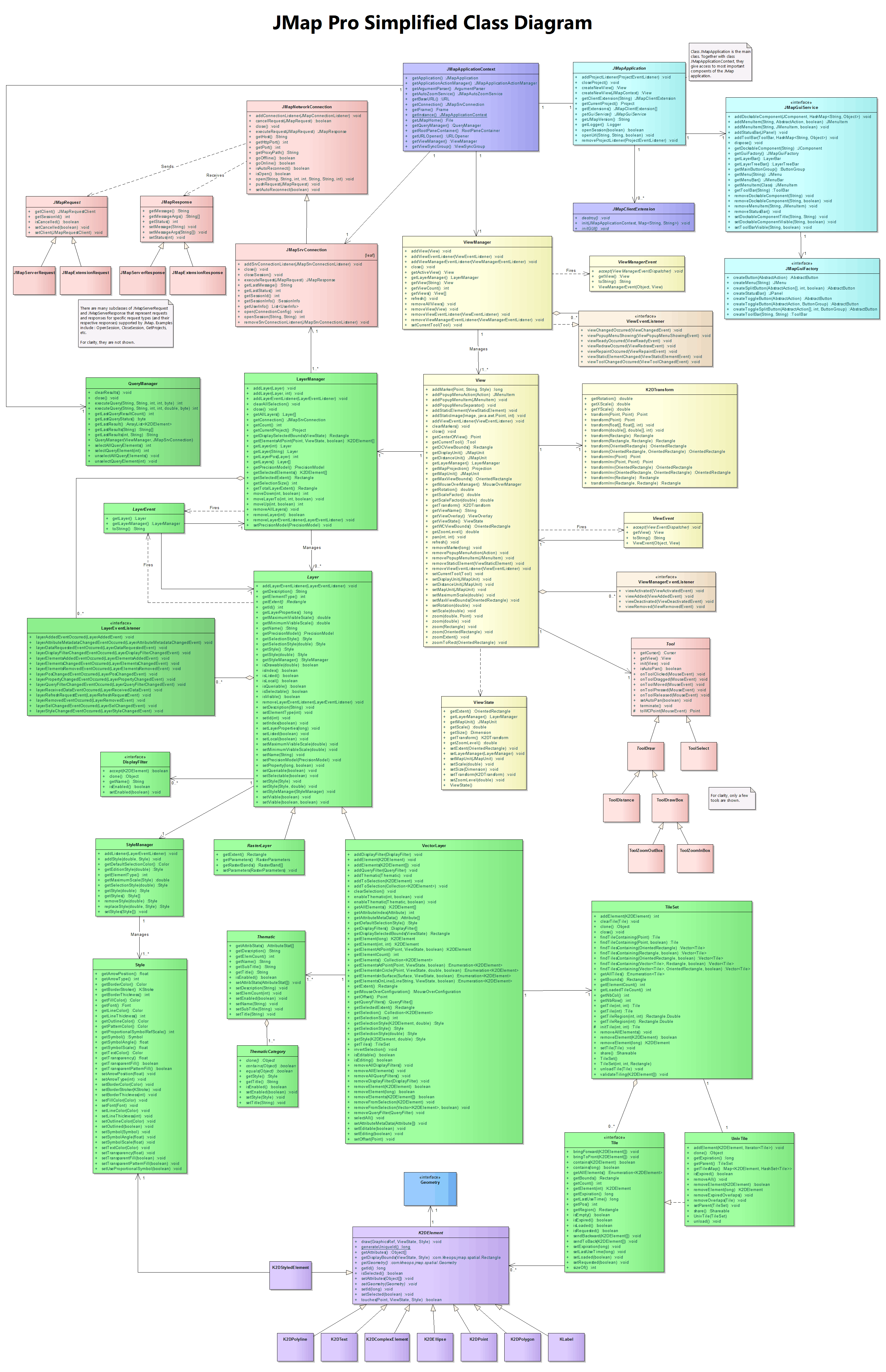 The following class diagram shows a simplified version of JMap Pro's architecture.