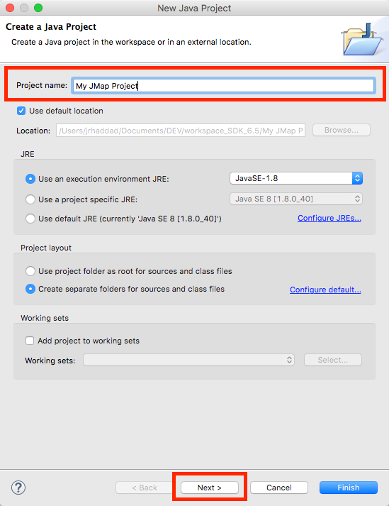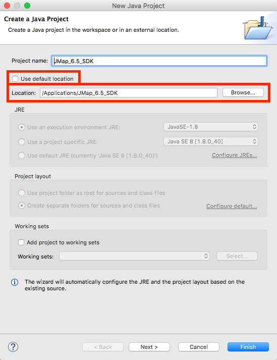 Select the path of the JMap 6.5 SDK that was specified when it was installed. To do this, you must disable the Use default location option to let Eclipse browse a folder outside of the current workspace. The project name is set automatically when the folder is selected. Press Finish.