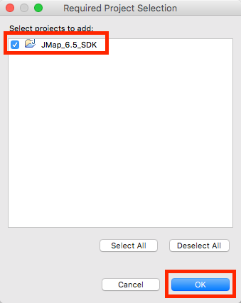 Select the JMap SDK project. All of the SDK's libraries will become available for your project. Press OK.
