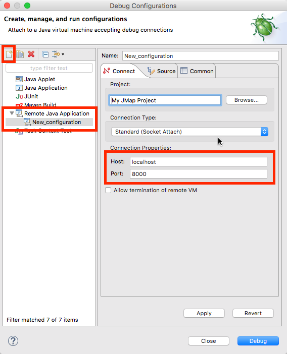 In Eclipse, you must create a remote debugging configuration using the same parameters given in the configuration file shown above (these are the default parameters).