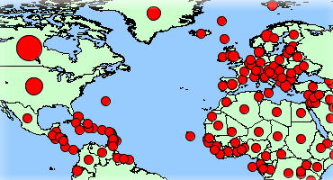 Las temáticas de tipo símbolos proporcionales muestran símbolos circulares superpuestos sobre el centro de los elementos a los cuales califican. El tamaño de los símbolos es determinado mediante la interpolación entre los valores mínimo y máximo de un atributo numérico dado.