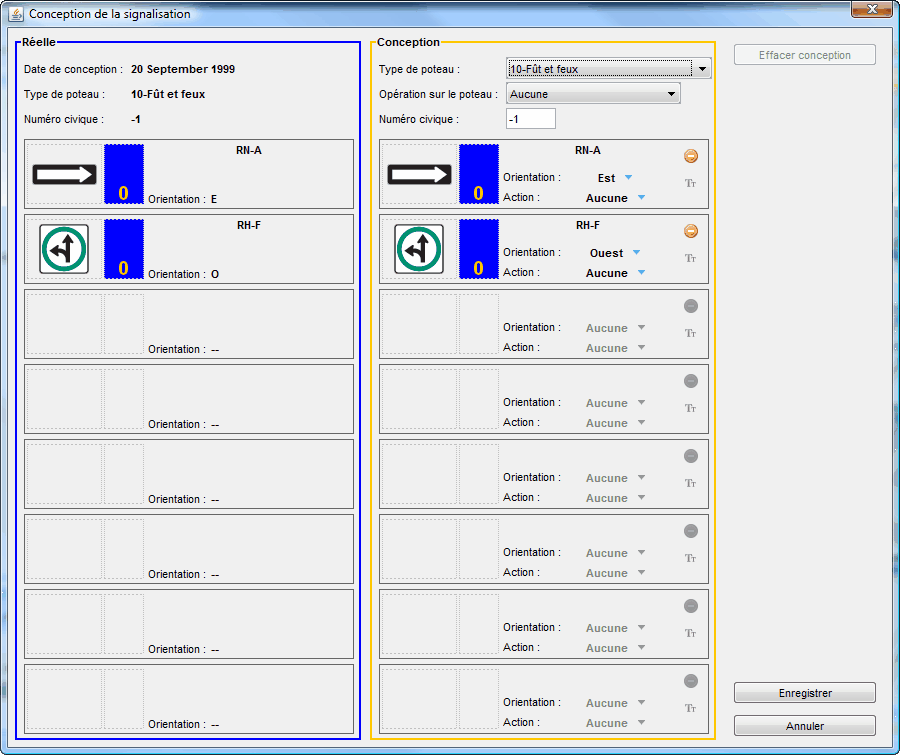Dans la fenêtre d'édition de la signalisation, la partie de gauche montre la signalisation réelle du poteau tandis que la partie de droite est éditable et permet de gérer les modifications à apporter au poteau. Une modification sur le poteau ou sur un des panneaux entraînera un changement d'état du poteau et il sera alors en Conception.
