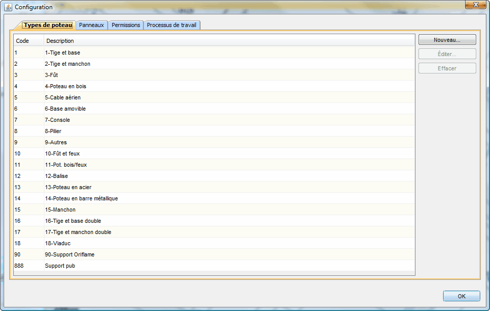 Liste des types de poteaux. |