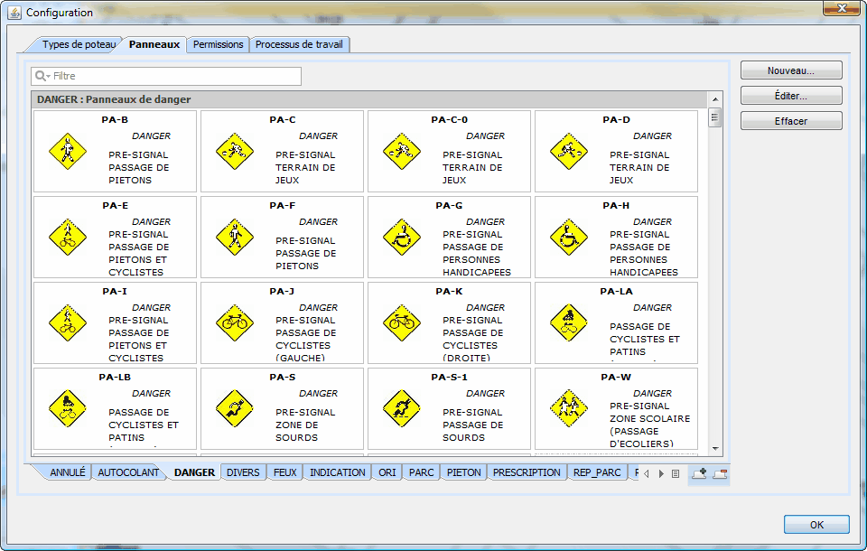 L'onglet Panneaux de la Configuration permet d'ajouter, d'éditer et d'effacer des panneaux en plus de les classer sous différentes catégories.